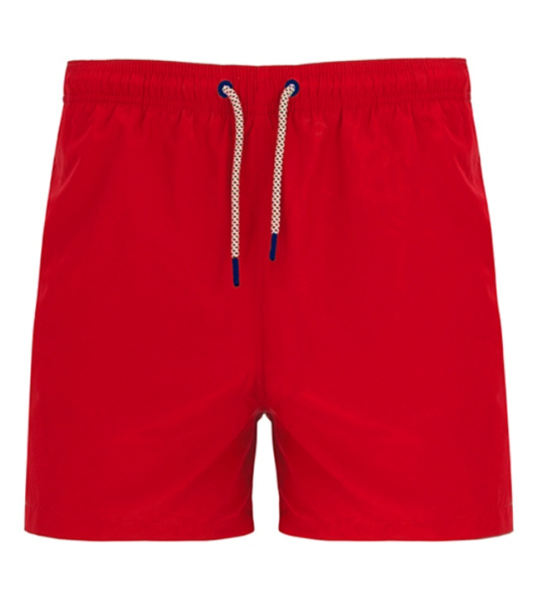 Plavky s dvěma postranními kapsami. Elastický pas s ozdobnými nastavitelnými šňůrkami a kontrastními kovovými očky. Kontrastní lemování na stranách. Zadní kapsa s očkem pro odtok vody.